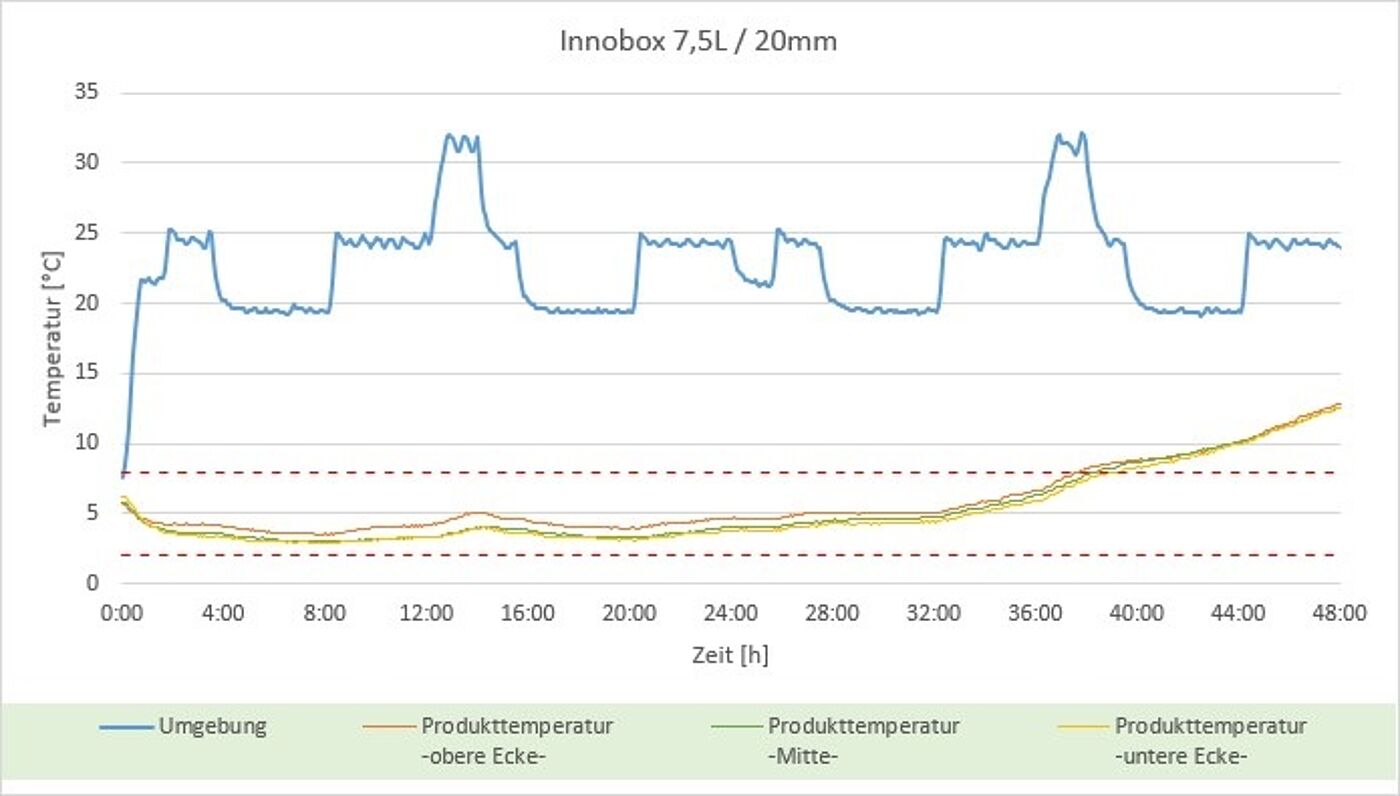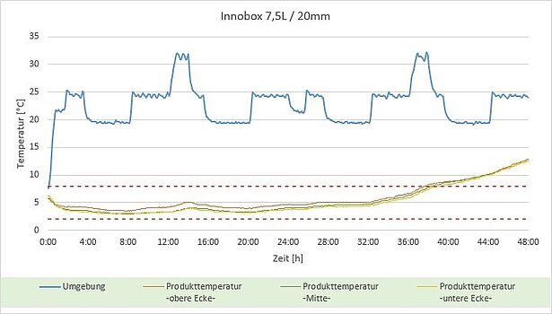 Klimakammerstest von Ecocool zeigt: In der kleinsten INNOBox-Pharma Variante 7,5L wird die Solltemperatur von 2 bis 8 Grad rund 38 Stunden lang gehalten.